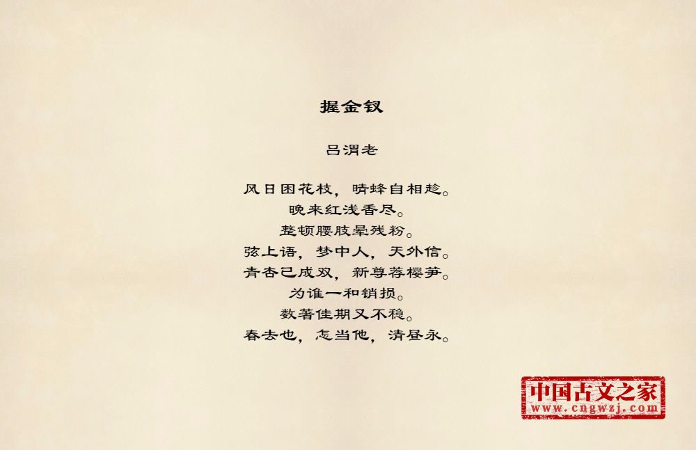 风日困花枝,晴蜂自相趁。晚来红浅香尽。整顿腰肢晕残粉。弦上语,梦中人,天外信。青杏已成双,新尊荐樱笋。为谁一和销损。数著佳期又不稳。春去也,怎当他,清昼永。