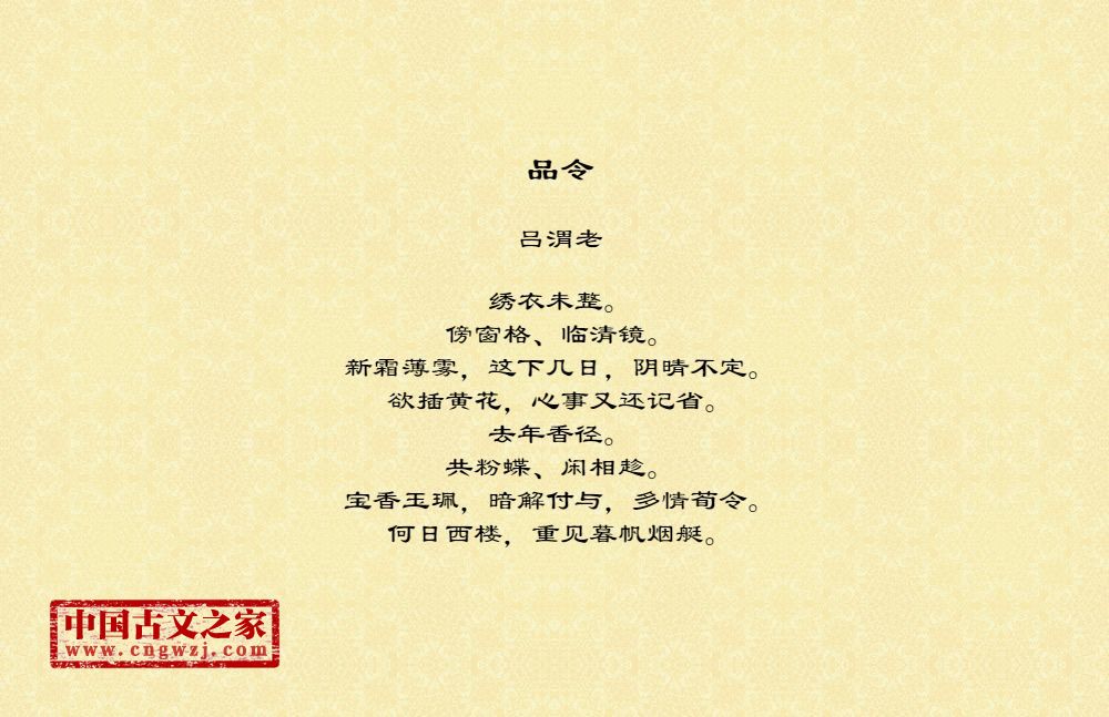 绣衣未整。傍窗格、临清镜。新霜薄雾,这下几日,阴晴不定。欲插黄花,心事又还记省。去年香径。共粉蝶、闲相趁。宝香玉珮,暗解付与,多情荀令。何日西楼,重见暮帆烟艇。