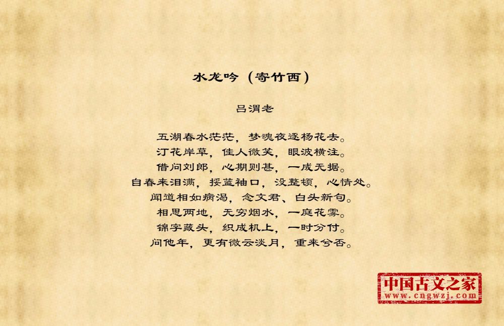 五湖春水茫茫,梦魂夜逐杨花去。汀花岸草,佳人微笑,眼波横注。借问刘郎,心期则甚,一成无据。自春来泪满,挼蓝袖口,没整顿,心情处。闻道相如病渴,念文君、白头新句。相思两地,无穷烟水,一庭花雾。锦字藏头,织成机上,一时分付。问他年,更有微云淡月,重来兮否。