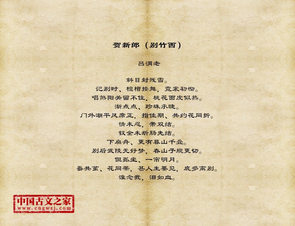 吕渭老(生卒年不详),一作吕滨老,字圣求,嘉兴(今属浙江)人。宣和、靖康年间在朝做过小官,有诗名。南渡后情况不详。赵师岌序其词云:“宣和末,有吕圣求者
