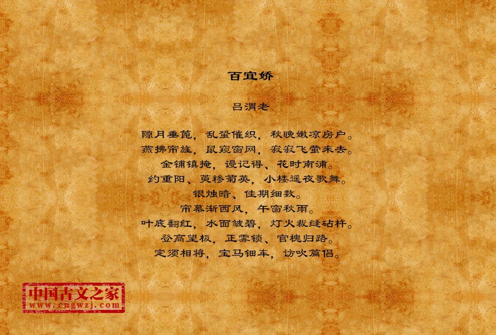 吕渭老(生卒年不详),一作吕滨老,字圣求,嘉兴(今属浙江)人。宣和、靖康年间在朝做过小官,有诗名。南渡后情况不详。赵师岌序其词云:“宣和末,有吕圣求者