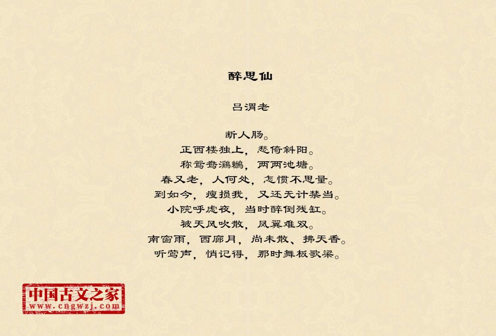 断人肠。正西楼独上,愁倚斜阳。称鸳鸯鸂鶒,两两池塘。春又老,人何处,怎惯不思量。到如今,瘦损我,又还无计禁当。小院呼虑夜,当时醉倒残缸。被天风吹散,凤翼难双。南窗雨,西廊月,尚未散、拂天香。听莺声,悄记得,那时舞板歌梁。