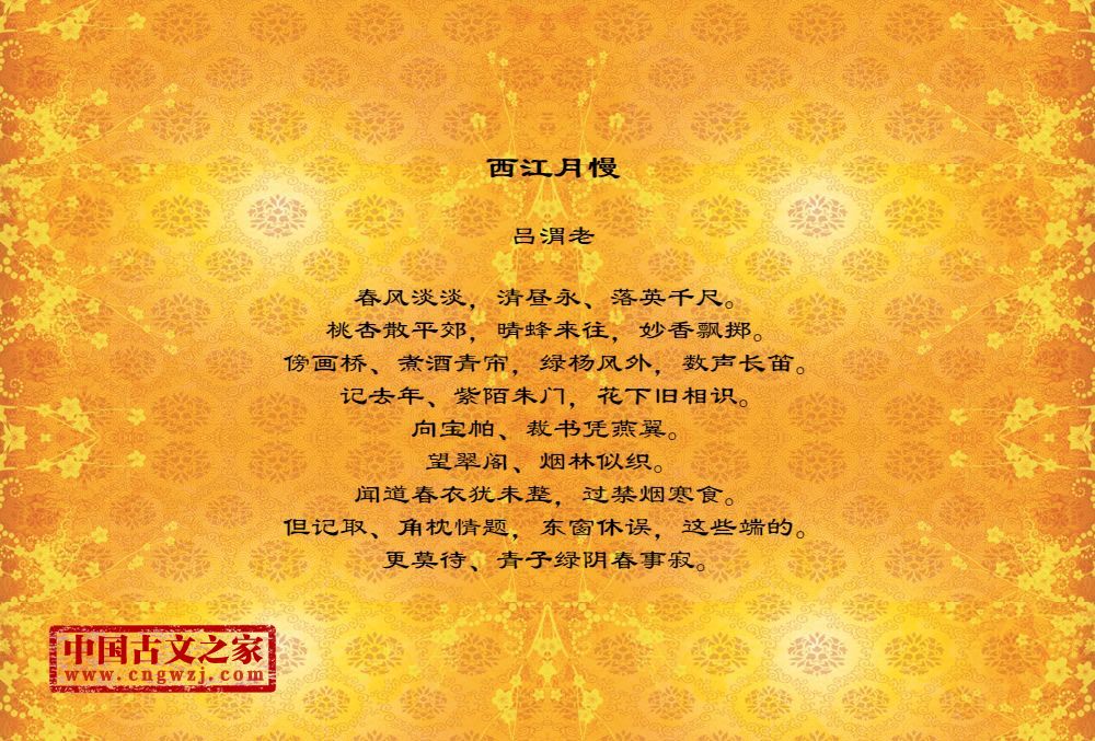 吕渭老(生卒年不详),一作吕滨老,字圣求,嘉兴(今属浙江)人。宣和、靖康年间在朝做过小官,有诗名。南渡后情况不详。赵师岌序其词云:“宣和末,有吕圣求者