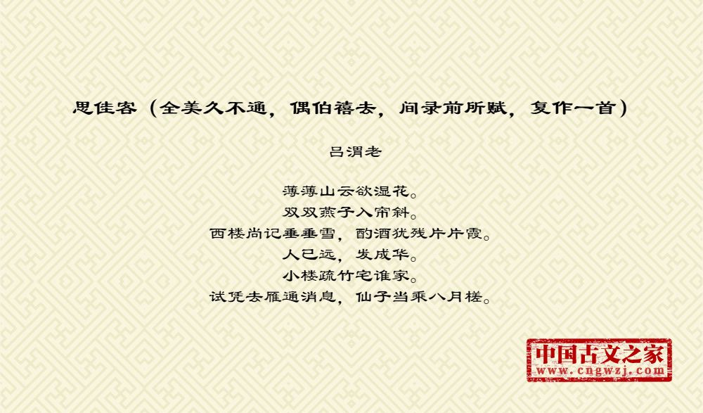 《思佳客(全美久不通,偶伯禧去,间录前所赋,复作一首)》由吕渭老创作