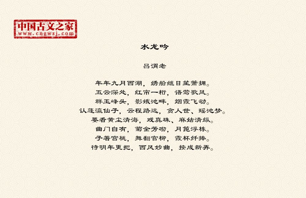 年年九月西湖,绣船继日笙箫拥。五云深处,红帘一桁,语莺歌凤。群玉峰头,影娥池畔,烟霞飞动。认蓬瀛仙子,云程路远,贪人世、瑶池梦。要看黄尘清海,戏真珠、麻姑清纵。曲门自有,菊金芳砌,月篦浮栋。子著宫桃,舞翻官柳,霞杯纤捧。待明年更把,西风妙曲,按成新弄。