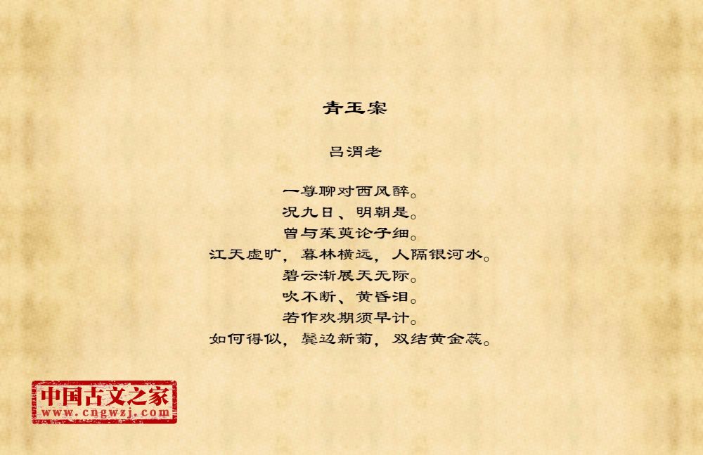 一尊聊对西风醉。况九日、明朝是。曾与茱萸论子细。江天虚旷,暮林横远,人隔银河水。碧云渐展天无际。吹不断、黄昏泪。若作欢期须早计。如何得似,鬓边新菊,双结黄金蕊。
