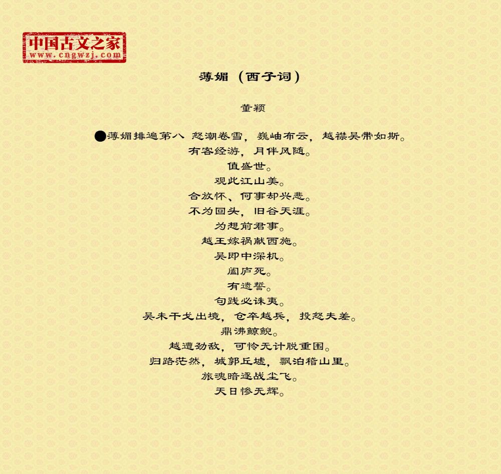 ●薄媚排遍第八 怒潮卷雪,巍岫布云,越襟吴带如斯。有客经游,月伴风随。值盛世。观此江山美。合放怀、何事却兴悲。不为回头,旧谷天涯。为想前君事。越王嫁祸献西施。吴即中深机。阖庐死。有遗誓。句践必诛夷。吴未干戈出境,仓卒越兵,投怒夫差。鼎沸鲸鲵。越遭劲敌,可怜无计脱重围。归路茫然,城郭丘墟,飘泊稽山里。旅魂暗逐战尘飞。天日惨无辉。