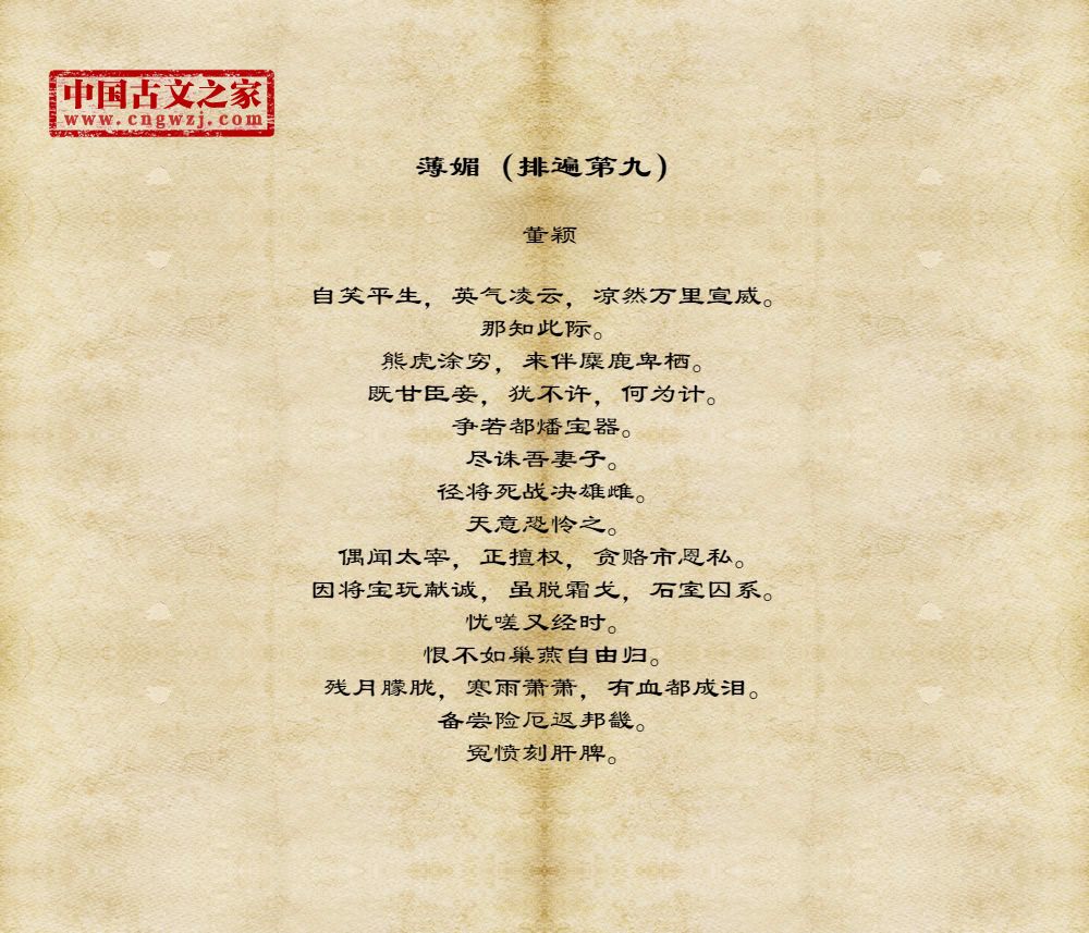 自笑平生,英气凌云,凉然万里宣威。那知此际。熊虎涂穷,来伴麋鹿卑栖。既甘臣妾,犹不许,何为计。争若都燔宝器。尽诛吾妻子。径将死战决雄雌。天意恐怜之。偶闻太宰,正擅权,贪赂市恩私。因将宝玩献诚,虽脱霜戈,石室囚系。忧嗟又经时。恨不如巢燕自由归。残月朦胧,寒雨萧萧,有血都成泪。备尝险厄返邦畿。冤愤刻肝脾。