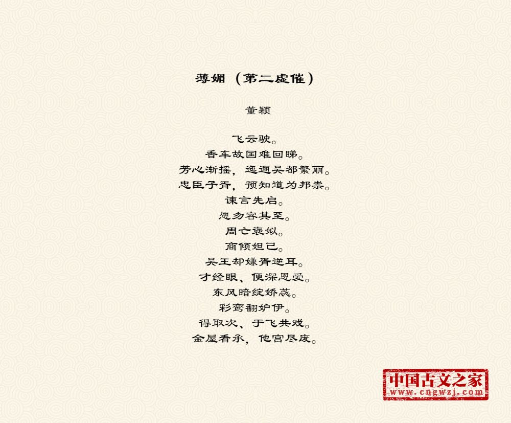 飞云驶。香车故国难回睇。芳心渐摇,迤逦吴都繁丽。忠臣子胥,预知道为邦祟。谏言先启。愿勿容其至。周亡褒姒。商倾妲己。吴王却嫌胥逆耳。才经眼、便深恩爱。东风暗绽娇蕊。彩鸾翻妒伊。得取次、于飞共戏。金屋看承,他宫尽废。