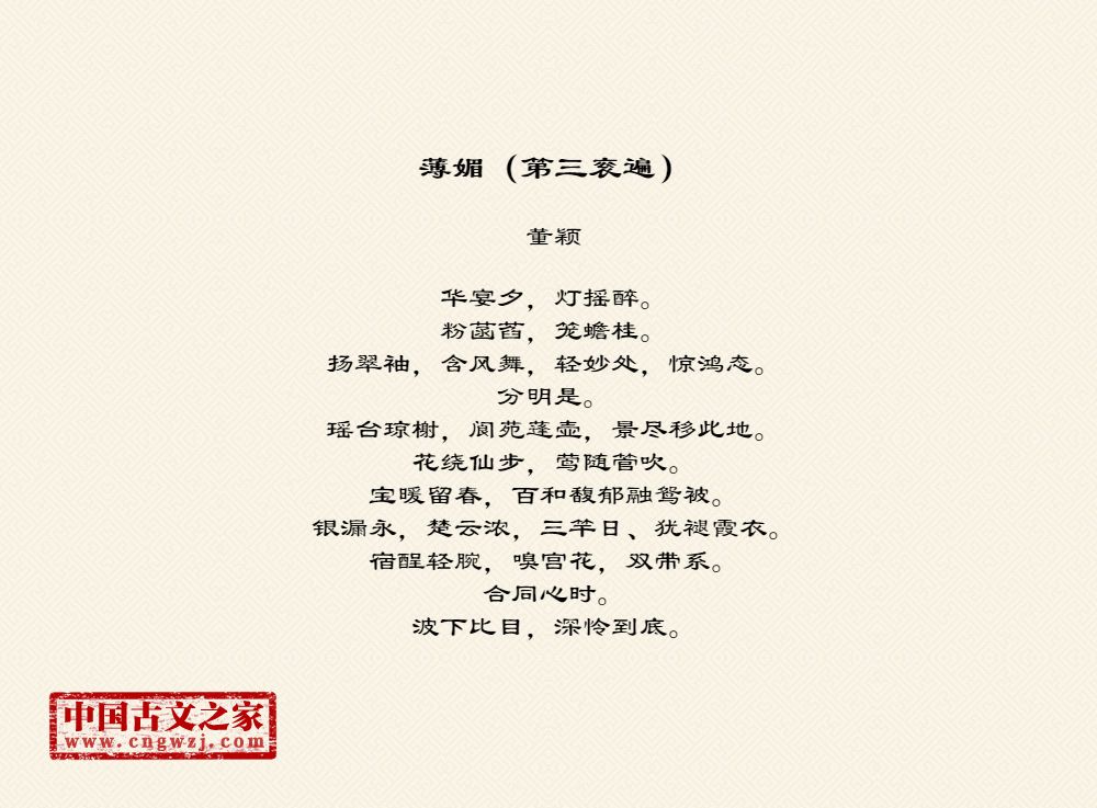 华宴夕,灯摇醉。粉菡萏,笼蟾桂。扬翠袖,含风舞,轻妙处,惊鸿态。分明是。瑶台琼榭,阆苑蓬壶,景尽移此地。花绕仙步,莺随管吹。宝暖留春,百和馥郁融鸳被。银漏永,楚云浓,三竿日、犹褪霞衣。宿酲轻腕,嗅宫花,双带系。合同心时。波下比目,深怜到底。