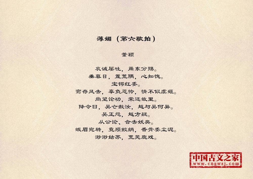哀诚屡吐,甬东分赐。垂暮日,置荒隅,心知愧。宝锷红委。鸾存凤去,辜负恩怜,情不似虞姬。尚望论功,荣还故里。降令曰,吴亡赦汝,越与吴何异。吴正怨,越方疑。从公论、合去妖类。蛾眉宛转,竟殒鲛绡,香骨委尘泥。渺渺姑苏,荒芜鹿戏。