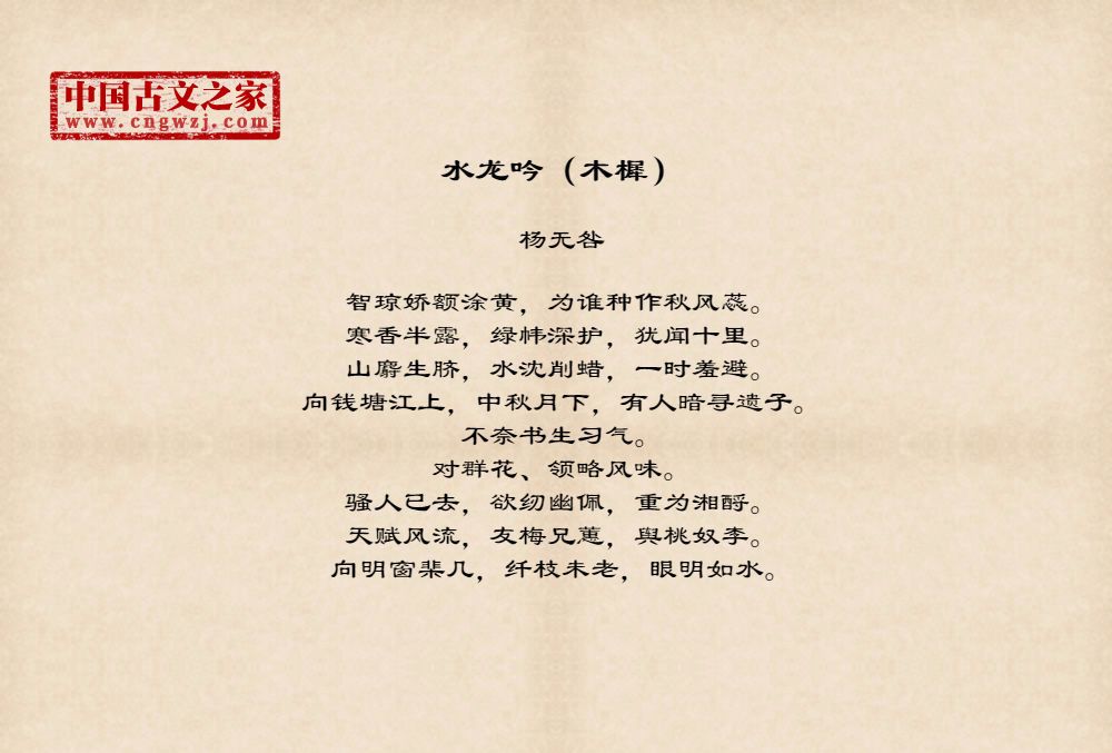 智琼娇额涂黄,为谁种作秋风蕊。寒香半露,绿帏深护,犹闻十里。山麝生脐,水沈削蜡,一时羞避。向钱塘江上,中秋月下,有人暗寻遗子。不奈书生习气。对群花、领略风味。骚人已去,欲纫幽佩,重为湘酹。天赋风流,友梅兄蕙,舆桃奴李。向明窗棐几,纤枝未老,眼明如水。