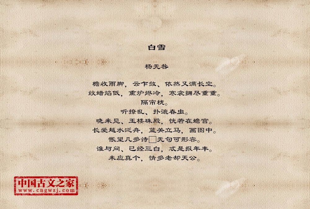 檐收雨脚,云乍敛、依然又满长空。纹蜡焰低,熏炉烬冷,寒衾拥尽重重。隔帘栊。听撩乱、扑漉春虫。晓来见、玉楼珠殿,恍若在蟾宫。长爱越水泛舟,蓝关立马,画图中。怅望几多诗□无句可形容。谁与问、已经三白,忒是报年丰。未应真个,情多老却天公。