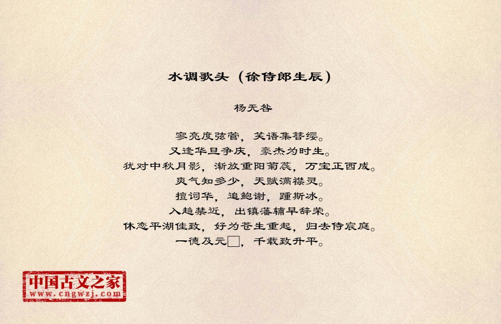 寥亮度弦管,笑语集簪缨。又逢华旦争庆,豪杰为时生。犹对中秋月影,渐放重阳菊蕊,万宝正西成。爽气知多少,天赋满襟灵。擅词华,追鲍谢,踵斯冰。入趋禁近,出镇藩辅早辞荣。休恋平湖佳致,好为苍生重起,归去侍宸庭。一德及元□,千载致升平。