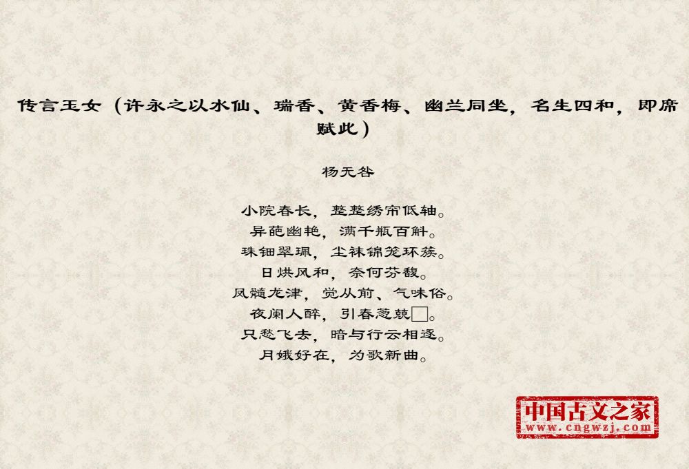 《传言玉女(许永之以水仙、瑞香、黄香梅、幽兰同坐,名生四和,即席赋此)》的原文打印版(杨无咎)