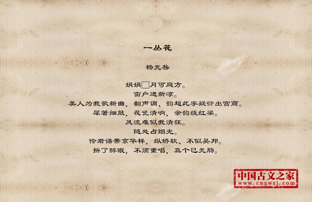 娟娟□月可庭方。窗户进新凉。美人为我歌新曲,翻声调、韵超此字疑衍出宫商。犀箸细敲,花瓷清响,余韵绕红梁。风流难似我清狂。随处占烟光。怜君语带京华样,纵娇软、不似吴邦。拚了醉眠,不须重唱,真个已无肠。