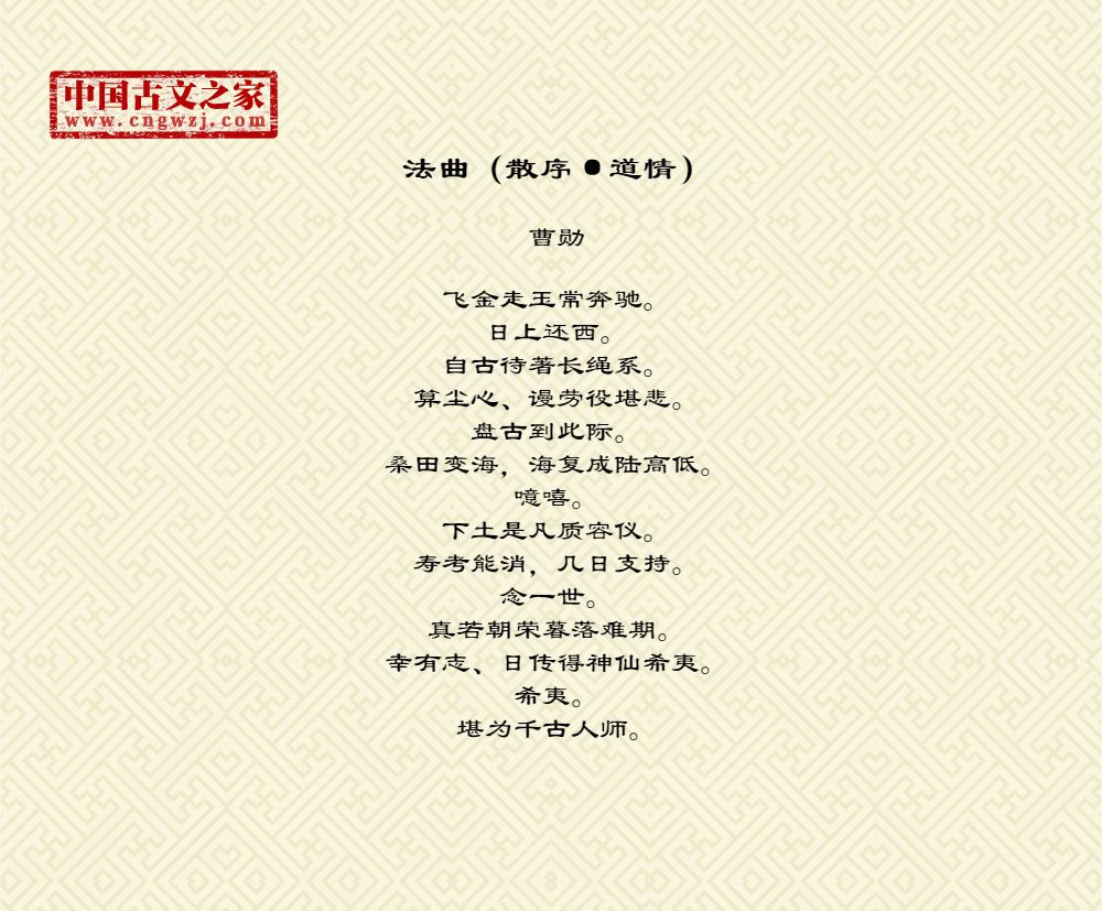 飞金走玉常奔驰。日上还西。自古待著长绳系。算尘心、谩劳役堪悲。盘古到此际。桑田变海,海复成陆高低。噫嘻。下土是凡质容仪。寿考能消,几日支持。念一世。真若朝荣暮落难期。幸有志、日传得神仙希夷。希夷。堪为千古人师。