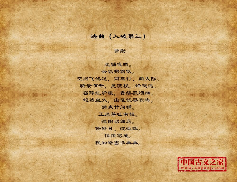 光铺晓曦。云影拂霜低。空阔飞鸿过,两三行、向天际。晴景乍升,晃疏棂,蜂翅迷。密障红炉暖,香缕飘烟细。超然坐久,幽径试寻寒梅。酥点竹间稀。正疏蓓吐南枝。微阳动细蕊。任斜日、沈淡晖。惨惨寒成。晚知皓雪欲垂垂。