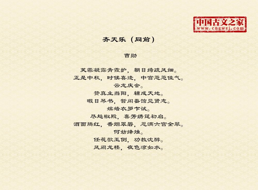 芙蓉凝露青霞护,朝日绮疏风细。正是中秋,时候喜逢,中宫葱葱佳气。云龙庆会。赞真主当阳,辅成天地。暇日琴书,暂闲蚕馆见贤志。嫔嫱衣罗乍试。尽趋椒殿,喜芳绣筵初启。酒面腾红,香烟罩碧,恩满六宫金翠。何妨绛烛。任花欹玉侧,劝教沈醉。凤阙龙楼,夜色凉如水。