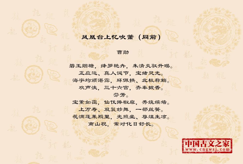 碧玉烟塘,绛罗艳卉,朱清炎驭升晹。正应运、真人诞节,宝绪灵光。海宇均颁湛露,环佩拱、北极称觞。欢声浃,三十六宫,齐奉披香。芬芳。宝薰如霭,仙仗捧椒扉,秀绕嫔嫱。上万寿、双鬟妙舞,一部丝簧。花满蓬莱殿里,光照坐、尊俎生凉。南山祝,常对化日舒长。