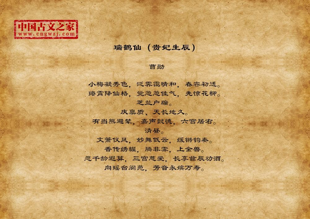 小梅凝秀色,泛霁霭晴和,春容初透。璿霄降仙格,觉葱葱佳气,先惊花柳。芝兰户牖。庆禀质、天长地久。有当熊避辇,嘉声懿德,六宫居右。清昼。文箫仪凤,妙舞低云,缓锵钧奏。香传绣幄,腾非雾,上金兽。愿千龄遐算,三宫慈爱,长享兹辰劝酒。向瑶台阆苑,芳音永嫔万寿。