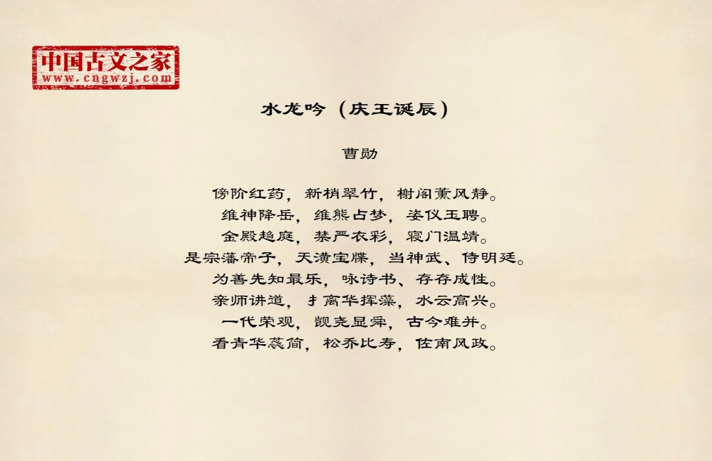 傍阶红药,新梢翠竹,榭阁薰风静。维神降岳,维熊占梦,姿仪玉聘。金殿趋庭,禁严衣彩,寝门温靖。是宗藩帝子,天潢宝牒,当神武、侍明廷。为善先知最乐,咏诗书、存存成性。亲师讲道,扌离华挥藻,水云高兴。一代荣观,觊尧显舜,古今难并。看青华蕊简,松乔比寿,佐南风政。