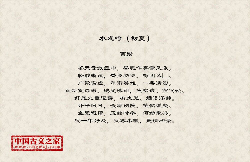 鉴天云敛壶中,昼暖乍喜薰风永。轻纱渐试,香罗初褪,梅阴又□。广殿窗虚,翠帘卷起,一番清影。正新篁绿嫩,池光涨雨,鱼吹浪、燕飞径。好是九重邃密,有岚光、烟溪深静。升平暇日,长廊别院,笙歌缓整。宝辇迟留,玉觞时举,何妨乘兴。况一年好处,犹寒未暖,是清和景。