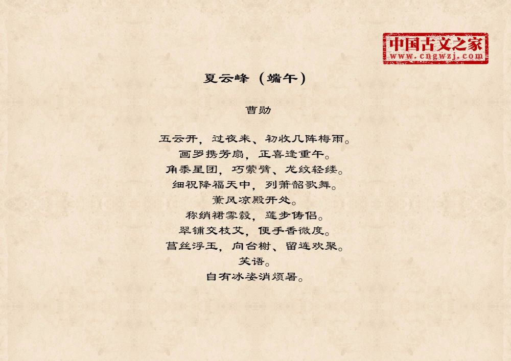 五云开,过夜来、初收几阵梅雨。画罗携芳扇,正喜逢重午。角黍星团,巧萦臂、龙纹轻缕。细祝降福天中,列箫韶歌舞。薰风凉殿开处。称绡裙雾縠,莲步俦侣。翠铺交枝艾,便手香微度。菖丝浮玉,向台榭、留连欢聚。笑语。自有冰姿消烦暑。
