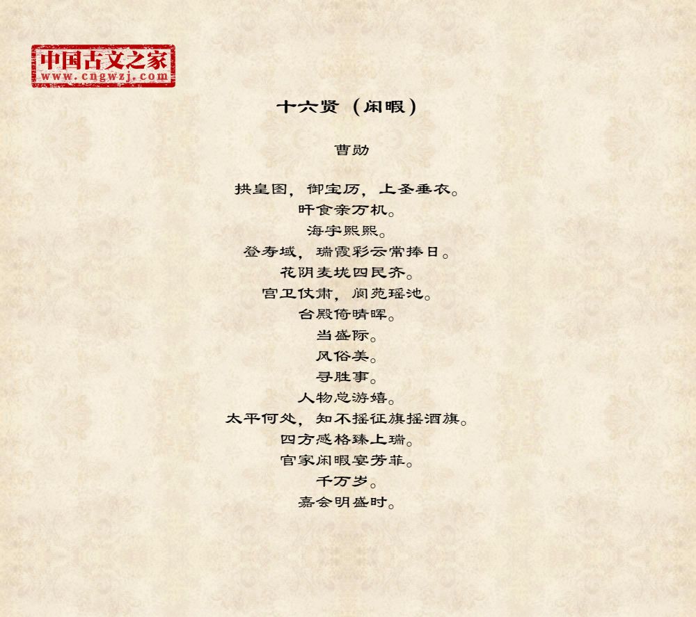 拱皇图,御宝历,上圣垂衣。旰食亲万机。海宇熙熙。登寿域,瑞霞彩云常捧日。花阴麦垅四民齐。宫卫仗肃,阆苑瑶池。台殿倚晴晖。当盛际。风俗美。寻胜事。人物总游嬉。太平何处,知不摇征旗摇酒旗。四方感格臻上瑞。官家闲暇宴芳菲。千万岁。嘉会明盛时。