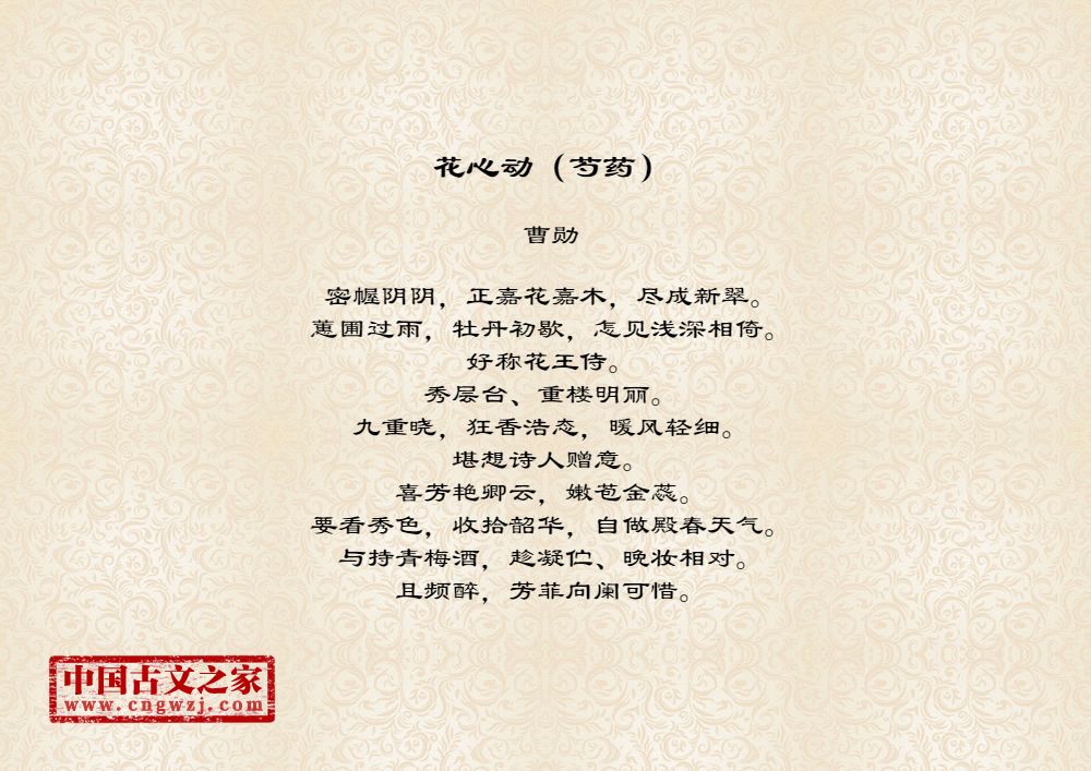 密幄阴阴,正嘉花嘉木,尽成新翠。蕙圃过雨,牡丹初歇,怎见浅深相倚。好称花王侍。秀层台、重楼明丽。九重晓,狂香浩态,暖风轻细。堪想诗人赠意。喜芳艳卿云,嫩苞金蕊。要看秀色,收拾韶华,自做殿春天气。与持青梅酒,趁凝伫、晚妆相对。且频醉,芳菲向阑可惜。