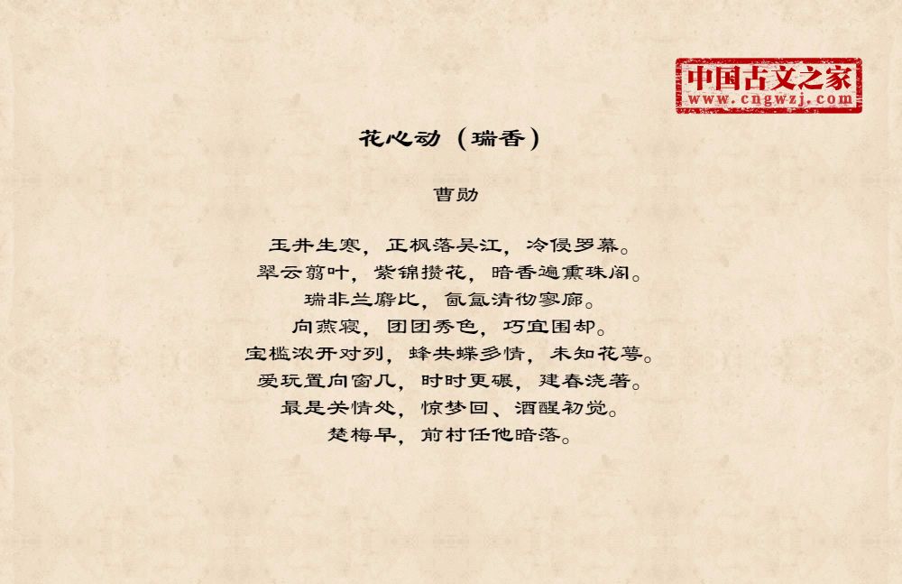 玉井生寒,正枫落吴江,冷侵罗幕。翠云翦叶,紫锦攒花,暗香遍熏珠阁。瑞非兰麝比,氤氲清彻寥廊。向燕寝,团团秀色,巧宜围却。宝槛浓开对列,蜂共蝶多情,未知花萼。爱玩置向窗几,时时更碾,建春浇著。最是关情处,惊梦回、酒醒初觉。楚梅早,前村任他暗落。