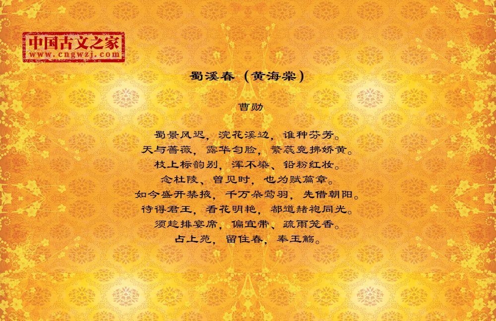 蜀景风迟,浣花溪边,谁种芬芳。天与蔷薇,露华匀脸,繁蕊竞拂娇黄。枝上标韵别,浑不染、铅粉红妆。念杜陵、曾见时,也为赋篇章。如今盛开禁掖,千万朵莺羽,先借朝阳。待得君王,看花明艳,都道赭袍同光。须趁排宴席,偏宜带、疏雨笼香。占上苑,留住春,奉玉觞。