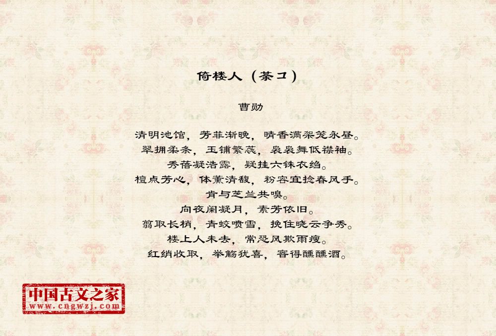 清明池馆,芳菲渐晚,晴香满架笼永昼。翠拥柔条,玉铺繁蕊,袅袅舞低襟袖。秀蓓凝浩露,疑挂六铢衣绉。檀点芳心,体薰清馥,粉容宜捻春风手。肯与芝兰共嗅。向夜阑凝月,素芳依旧。翦取长梢,青蛟喷雪,挽住晓云争秀。楼上人未去,常恐风欺雨瘦。红绡收取,举觞犹喜,窨得醺醺酒。