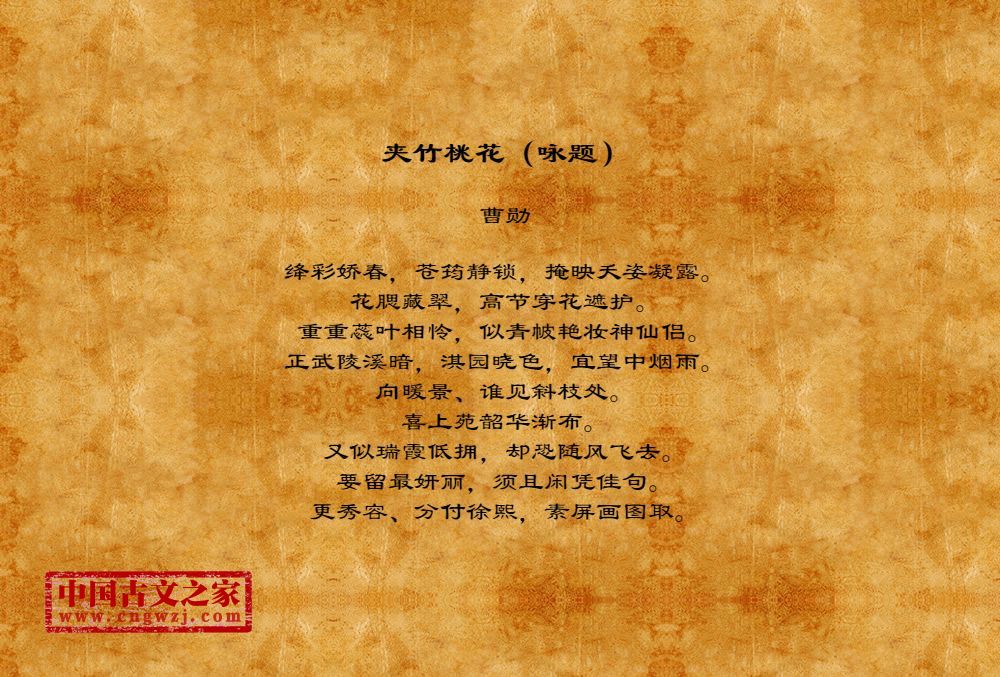 绛彩娇春,苍筠静锁,掩映夭姿凝露。花腮藏翠,高节穿花遮护。重重蕊叶相怜,似青帔艳妆神仙侣。正武陵溪暗,淇园晓色,宜望中烟雨。向暖景、谁见斜枝处。喜上苑韶华渐布。又似瑞霞低拥,却恐随风飞去。要留最妍丽,须且闲凭佳句。更秀容、分付徐熙,素屏画图取。