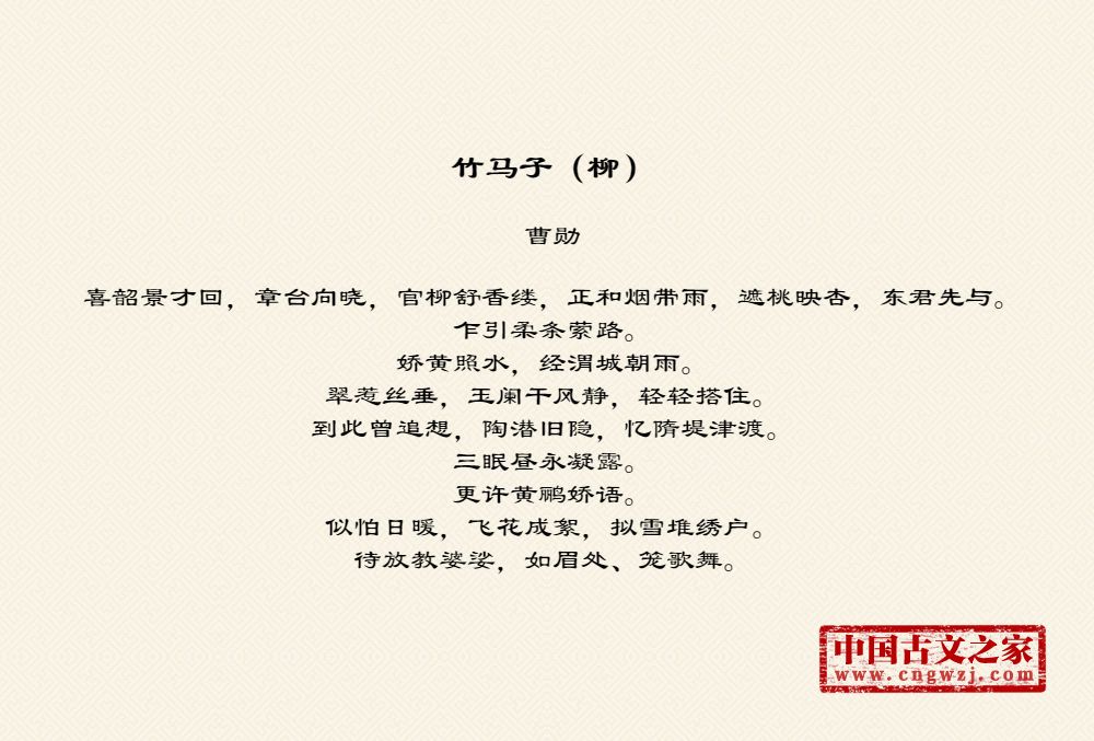 喜韶景才回,章台向晓,官柳舒香缕,正和烟带雨,遮桃映杏,东君先与。乍引柔条萦路。娇黄照水,经渭城朝雨。翠惹丝垂,玉阑干风静,轻轻搭住。到此曾追想,陶潜旧隐,忆隋堤津渡。三眠昼永凝露。更许黄鹂娇语。似怕日暖,飞花成絮,拟雪堆绣户。待放教婆娑,如眉处、笼歌舞。