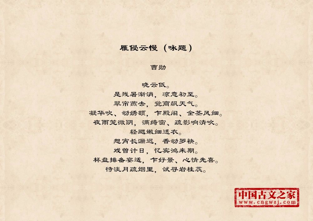 晓云低。是残暑渐消,凉意初至。翠帘燕去,觉商飙天气。凝华吹、动绣额,乍殿阁、金茎风细。夜雨笼微阴,满绮窗、疏影响清吹。轻颸嫩细透衣。想宵长漏迟,香动罗袂。戏曾计日,忆宾鸿来期。杯盘排备宴适,乍好景、心情先喜。待淡月疏烟里,试寻岩桂蕊。