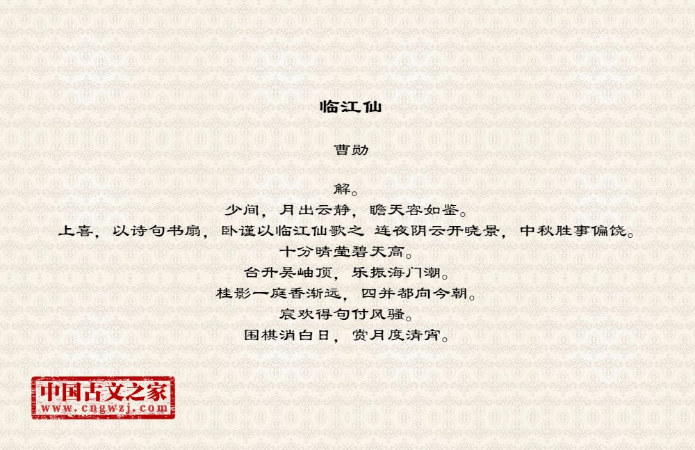 解。少间,月出云静,瞻天容如鉴。上喜,以诗句书扇,卧谨以临江仙歌之 连夜阴云开晓景,中秋胜事偏饶。十分晴莹碧天高。台升吴岫顶,乐振海门潮。桂影一庭香渐远,四并都向今朝。宸欢得句付风骚。围棋消白日,赏月度清宵。