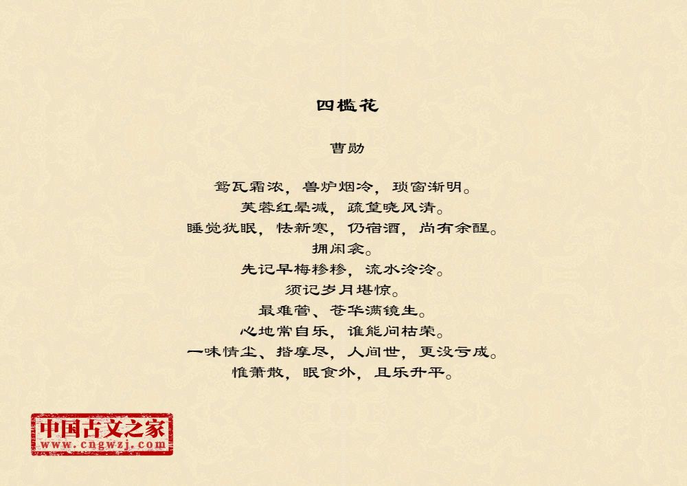鸳瓦霜浓,兽炉烟冷,琐窗渐明。芙蓉红晕减,疏篁晓风清。睡觉犹眠,怯新寒,仍宿酒,尚有余酲。拥闲衾。先记早梅糁糁,流水泠泠。须记岁月堪惊。最难管、苍华满镜生。心地常自乐,谁能问枯荣。一味情尘、揩摩尽,人间世,更没亏成。惟萧散,眠食外,且乐升平。