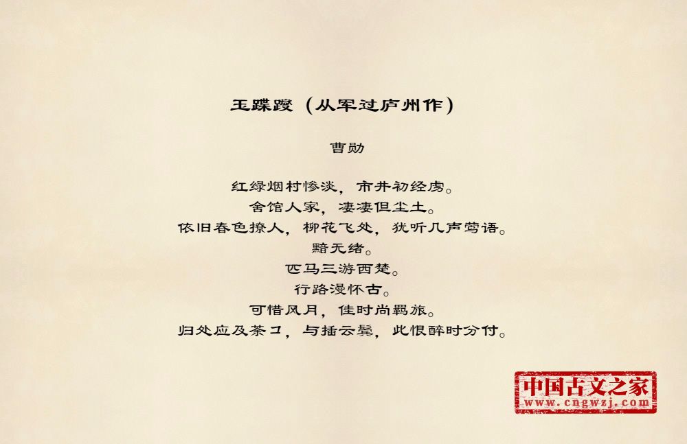 红绿烟村惨淡,市井初经虏。舍馆人家,凄凄但尘土。依旧春色撩人,柳花飞处,犹听几声莺语。黯无绪。匹马三游西楚。行路漫怀古。可惜风月,佳时尚羁旅。归处应及荼コ,与插云鬓,此恨醉时分付。