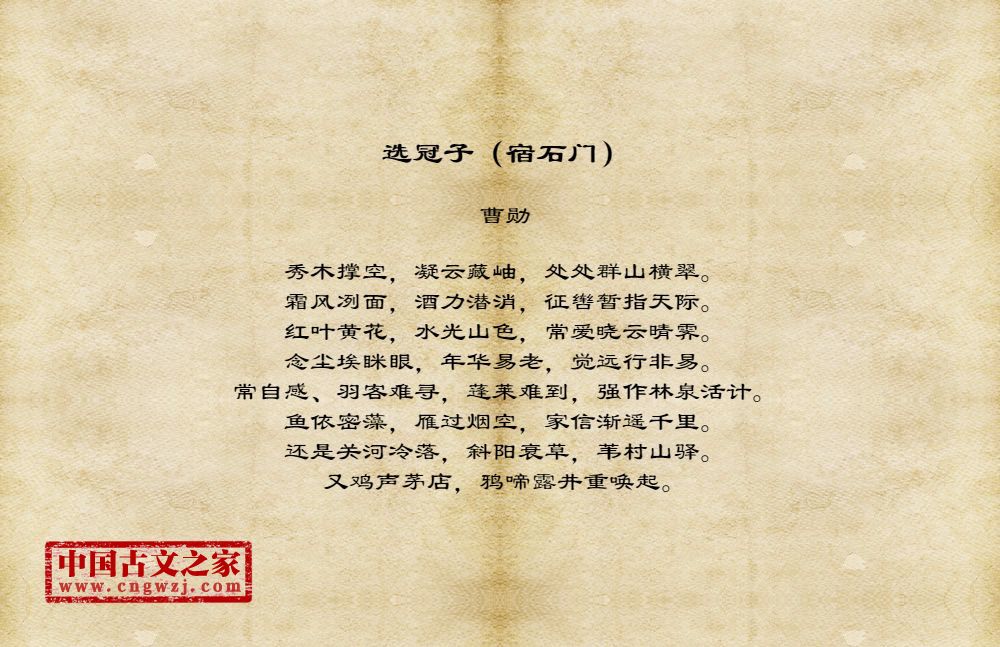 秀木撑空,凝云藏岫,处处群山横翠。霜风冽面,酒力潜消,征辔暂指天际。红叶黄花,水光山色,常爱晓云晴霁。念尘埃眯眼,年华易老,觉远行非易。常自感、羽客难寻,蓬莱难到,强作林泉活计。鱼依密藻,雁过烟空,家信渐遥千里。还是关河冷落,斜阳衰草,苇村山驿。又鸡声茅店,鸦啼露井重唤起。