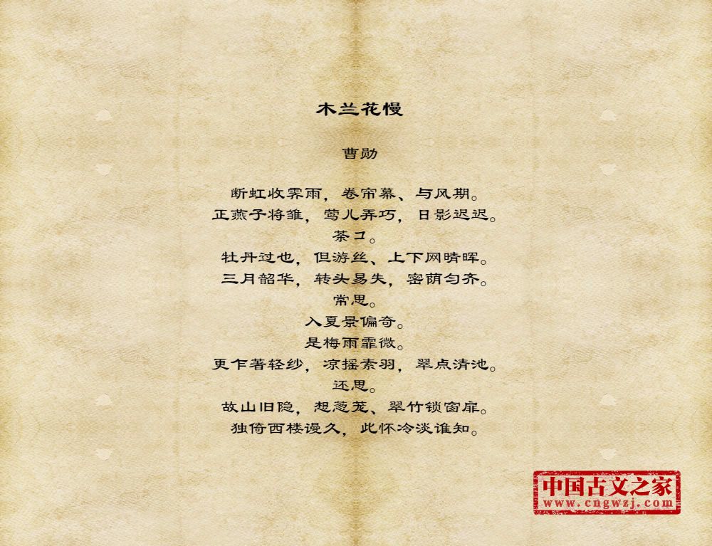 断虹收霁雨,卷帘幕、与风期。正燕子将雏,莺儿弄巧,日影迟迟。荼コ。牡丹过也,但游丝、上下网晴晖。三月韶华,转头易失,密荫匀齐。常思。入夏景偏奇。是梅雨霏微。更乍著轻纱,凉摇素羽,翠点清池。还思。故山旧隐,想葱茏、翠竹锁窗扉。独倚西楼谩久,此怀冷淡谁知。