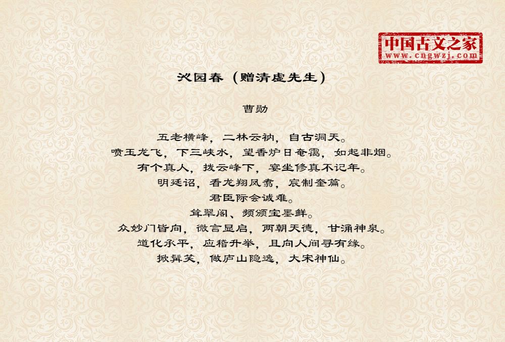 五老横峰,二林云衲,自古洞天。喷玉龙飞,下三峡水,望香炉日奄霭,如起非烟。有个真人,拨云峰下,宴坐修真不记年。明廷诏,看龙翔凤翥,宸制奎篇。君臣际会诚难。耸翠阁、频颁宝墨鲜。众妙门皆向,微言显启,两朝天德,甘涌神泉。道化承平,应稽升举,且向人间寻有缘。掀髯笑,做庐山隐逸,大宋神仙。