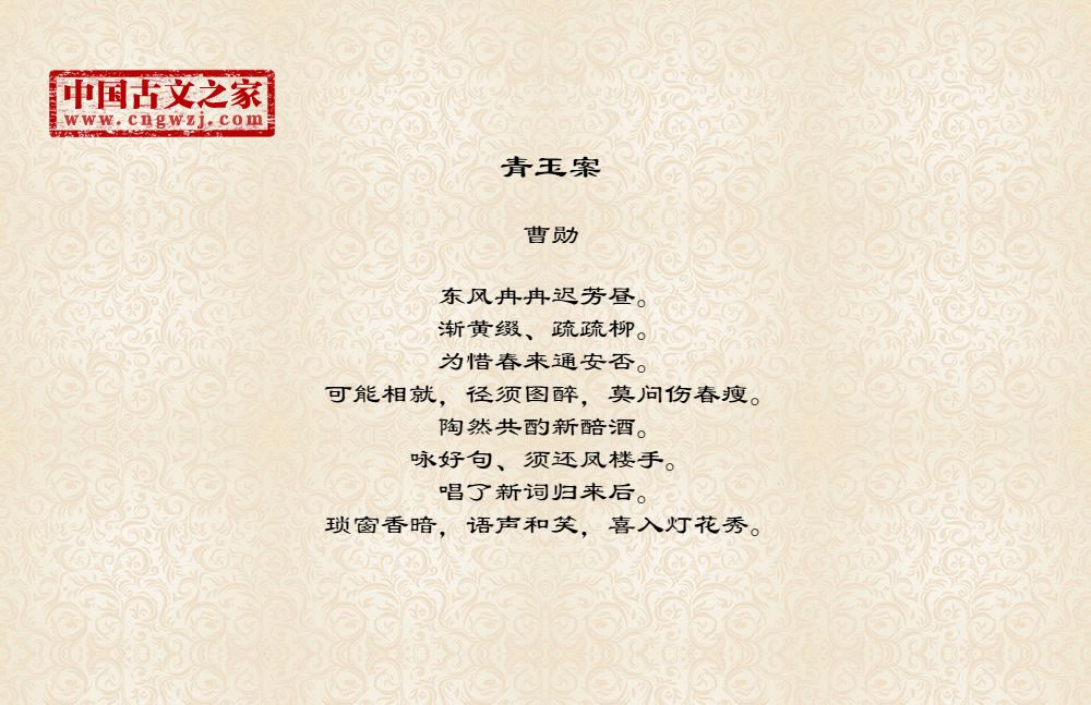 东风冉冉迟芳昼。渐黄缀、疏疏柳。为惜春来通安否。可能相就,径须图醉,莫问伤春瘦。陶然共酌新醅酒。咏好句、须还凤楼手。唱了新词归来后。琐窗香暗,语声和笑,喜入灯花秀。