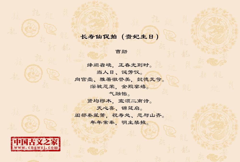 绛阙岧峣,正春光到时。当人日、诞芳仪。向宫壶、雅著徽誉美,懿德无亏。深被恩荣,金殿宴嬉。气融怡。贤均樛木,宜颂二南诗。天心喜、锦筵启。阖部奏笙箫,祝寿处、愿与山齐。年年常奉,明主禁掖。