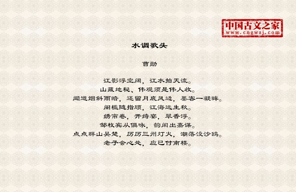 江影浮空阔,江水拍天流。山藏地秘、伟观须是伟人收。闻道烟斜雨暗,还留月底风边,墨客一凝眸。阑槛随指顾,江海远生秋。绣帘卷,开绮宴,翠香浮。邹枚宾从俱咏,韵闲出嘉谋。点点群山吴楚,历历三州灯火,潮落没沙鸥。老子会心处,应已付南楼。
