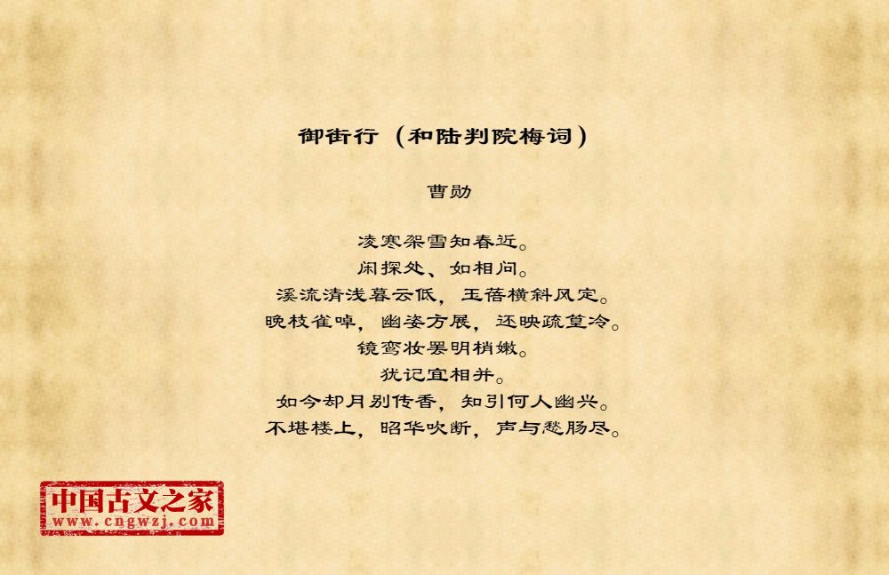 凌寒架雪知春近。闲探处、如相问。溪流清浅暮云低,玉蓓横斜风定。晚枝雀啅,幽姿方展,还映疏篁冷。镜鸾妆罢明梢嫩。犹记宜相并。如今却月别传香,知引何人幽兴。不堪楼上,昭华吹断,声与愁肠尽。