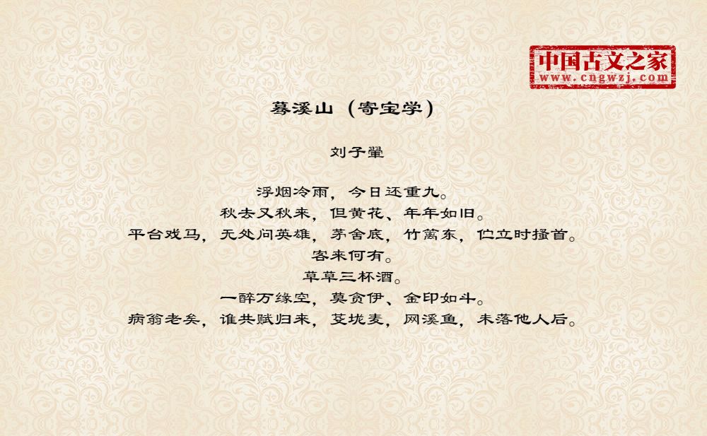 浮烟冷雨,今日还重九。秋去又秋来,但黄花、年年如旧。平台戏马,无处问英雄,茅舍底,竹篱东,伫立时搔首。客来何有。草草三杯酒。一醉万缘空,莫贪伊、金印如斗。病翁老矣,谁共赋归来,芟垅麦,网溪鱼,未落他人后。