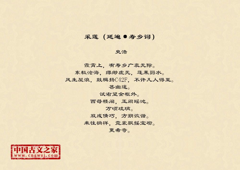 霞霄上,有寿乡广袤无际。东极沧海,缥缈虚无,蓬莱弱水。风生屋浪,鼓楫扬C42F,不许凡人得至。甚幽邃。试右望金枢外。西母楼阁,玉阙瑶池。万顷琉璃。双成倩巧,方朔诙谐。来往徜徉,霓裳飘摇宝砌。更希奇。