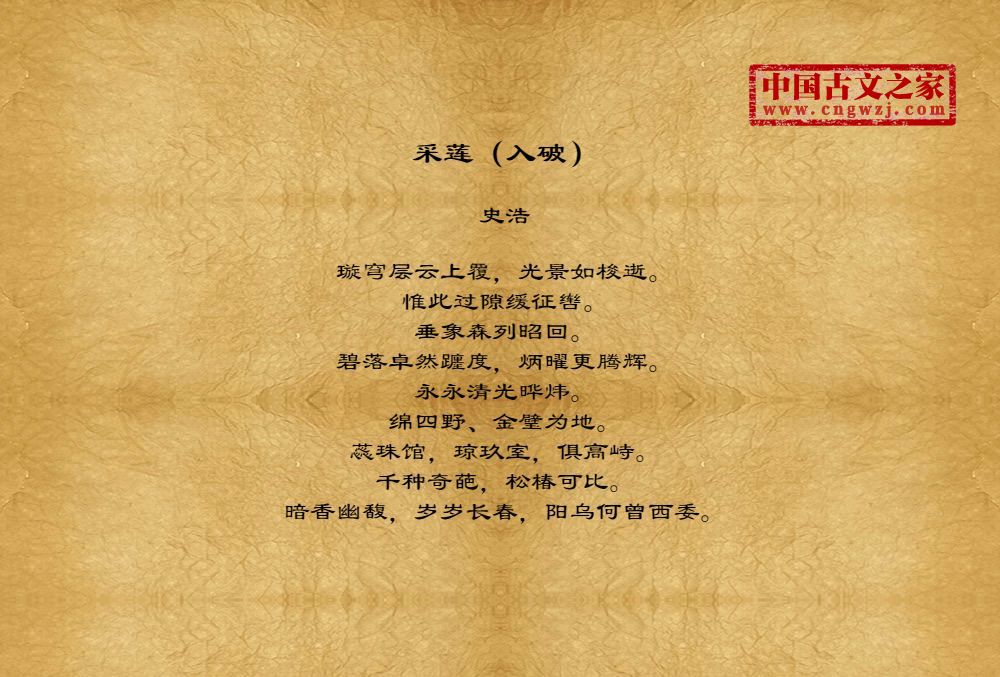 璇穹层云上覆,光景如梭逝。惟此过隙缓征辔。垂象森列昭回。碧落卓然躔度,炳曜更腾辉。永永清光晔炜。绵四野、金璧为地。蕊珠馆,琼玖室,俱高峙。千种奇葩,松椿可比。暗香幽馥,岁岁长春,阳乌何曾西委。
