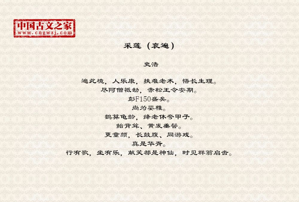 遍此境,人乐康,挟难老术,悟长生理。尽阿僧祗劫,赤松王令安期。彭F150盛矣。尚为婴稚。鹤算龟龄,绛老休夸甲子。鲐背耸、黄发垂髻。更童颜,长鼓腹、同游戏。真是华胥。行有歌,坐有乐,献笑都是神仙,时见群翁启齿。